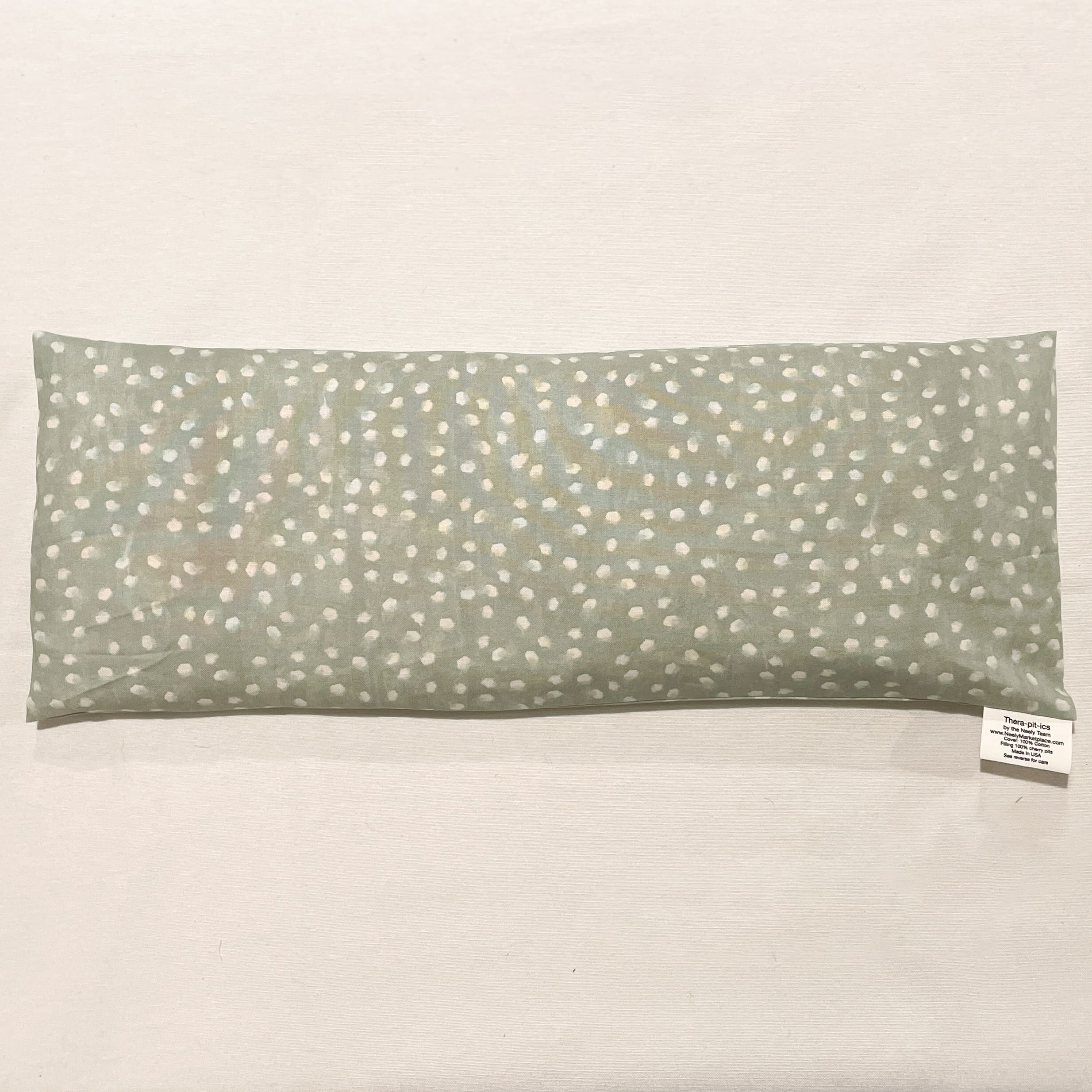 Filling is 100% cherry pits. Cover is 100% cotton. Size: 18″ x 7″ x 1″